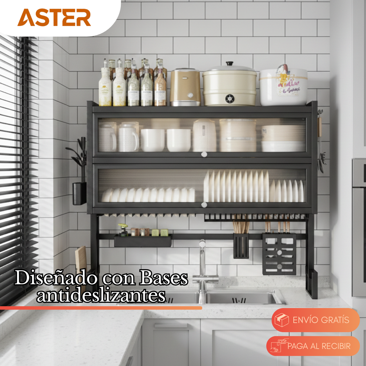 Su diseño elevado aprovecha el espacio sobre el lavaplatos, manteniendo tu cocina más ordenada, funcional y moderna.